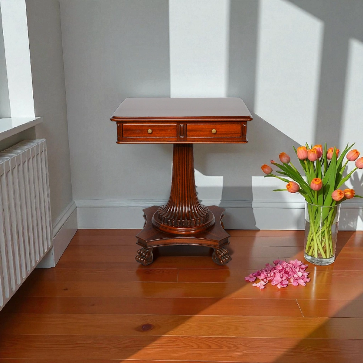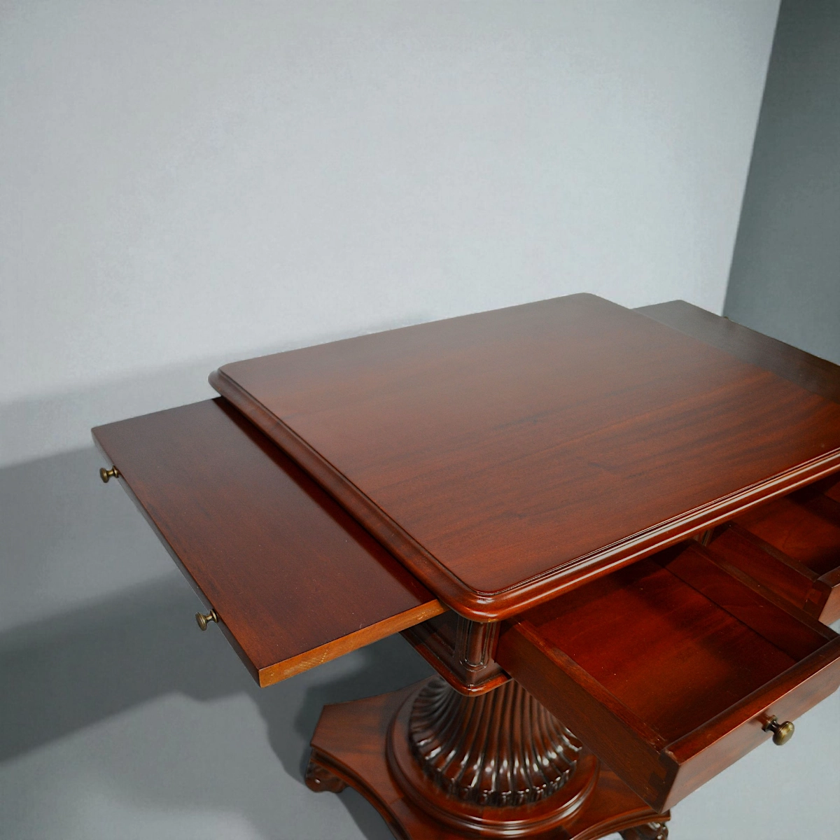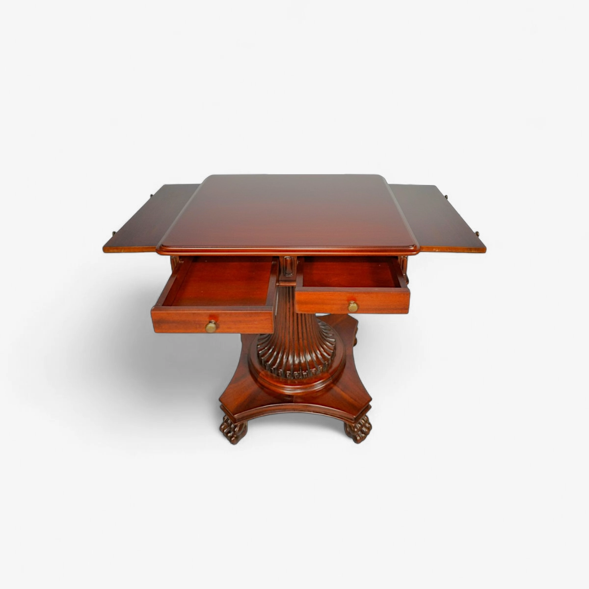 Розкладний столик (2602-083) або як раніше було прийнято називати - ломберний стіл, призначений для гри в карти та будь-які інші настільні ігри. Справжній витвір мистецтва, автентична копія класичного ломберного стола епохи регентства. Стійкий, становлений на одну ногу з широкою основою. Має дві невеличкі шухлядки та дві висувні стільниці по боках. Столик можно використовувати безпосередньо для настільних ігор або як елемент інтер'єру, приставляючи до бокових частин диванів чи крісел або просто використовувати як кавовий, чайний або ламповий столик. Ця частинка минулої епохи безумовно стане вишуканим доповненням Вашого інтер'єру.
