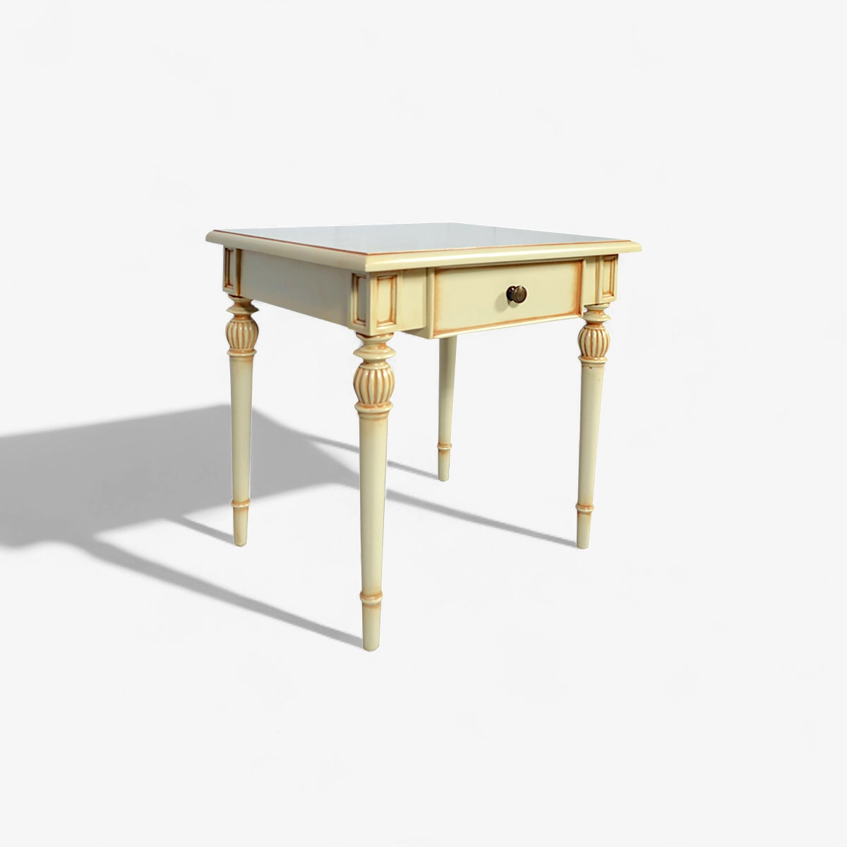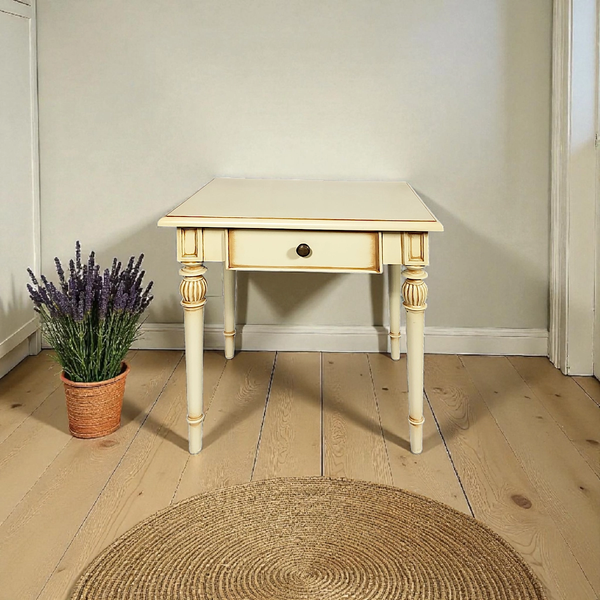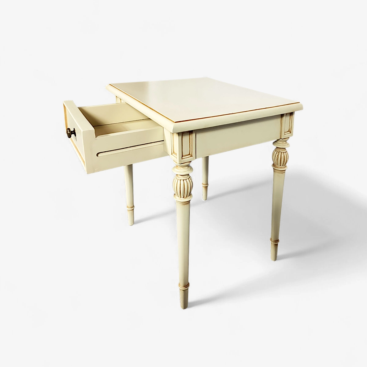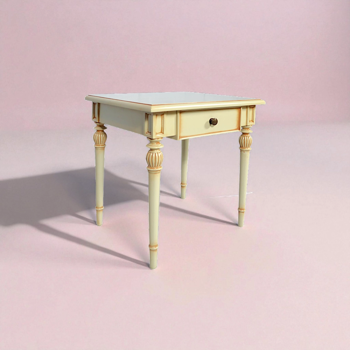 Тумбочка приліжкова (5304-139) з маленькою шухлядкою у стилі прованс. Має вигляд невеликого столика на витончених ніжках. Додасть інтер'єру Вашої оселі особливого шарму а ще й дозволить розташувати на собі необхідні речі або додатковий декор. Пофарбована в колір слонової кістки, та має характерне для провансу патинування. Виготовлена повністю з масиву червоного дерева.